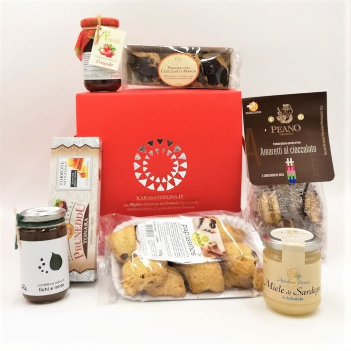 PUO´CONTENERE UNA SELEZIONE 5/6 PRODOTTI TIPICI SARDI. Elegante confezione in cartone rigido da regalare per festeggiare i tuoi momenti speciali. Su richiesta è possibile comporre la confezione con i tuoi prodotti preferiti, scelti sul nostro sito.Come procedere? Una volta inseriti a carrello...