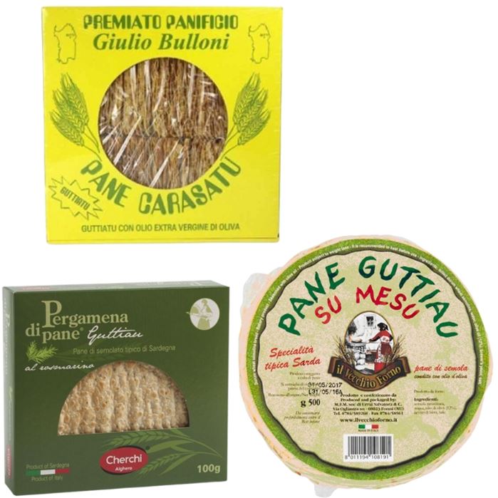 Il ´pane Guttiatu´ è ottenuto facendo colare un sottile filo d´olio extravergine sul pane carasatu tradizionale già cotto e condito con un pizzico di sale e facendolo abbrustolire in forno per alcuni minuti.Consigli e accostamenti: si accompagna in modo eccellente con salumi, formaggi...