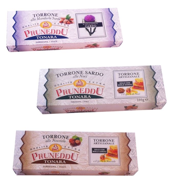 Il sapore pieno e sapido delle nocciole tostate esalta gli intensi aromi mediterranei del miele sardo.Il torrone Pruneddu è in commercio con i marchi Pruneddu, Barbagia, Arasulè, Toneri e Teliseri.E´ ricco di frutta secca minimo 50% del peso totale (minimo 37%, in quello alle noci).Consigli...