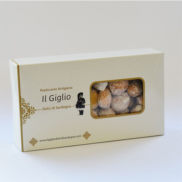 Fragranti palline lievitate contraddistinte dal gusto deciso del limone e da una delicata glassatura di zucchero a velo. Un dolce semplice e genuino, ricoperto da una golosa cappa, da gustare con tè o tisane. Custodiscono un segreto arcaico, conducendo chi li assaggia in un tempo remoto e bucolico, dove trionfa il senso di gioia dei giorni di festa. Dolci sardi artigianali frutto della pazienza di mani esperte, che hanno affinato manualità e tecnica durante gli anni, e dell'unione di ingredienti di prima scelta che restituiscono, a chi assapora i nostri dolci, quei profumi e sapori ancestrali, di un sapere custodito dalla cultura gastronomica e dalle tradizioni locali.