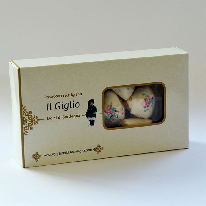 Biscotto ripieno di miele. Le copulettas con miele vengono confezionate con due sottili sfoglie di pasta che si chiudono a scrigno avvolgendo una densa crema di miele, decorate con una leggera glassatura e delle colorate praline di zucchero. Dolci sardi artigianali frutto della pazienza di mani esperte, che hanno affinato manualità e tecnica durante gli anni, e dell'unione di ingredienti di prima scelta che restituiscono, a chi assapora i nostri dolci, quei profumi e sapori ancestrali, di un sapere custodito dalla cultura gastronomica e dalle tradizioni locali.