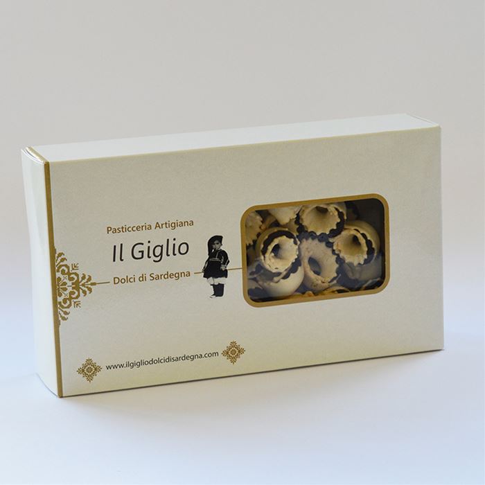 Biscotto ripieno di sapa di uve rosse realizzato interamente a mano con una sottile sfoglia di semola che si chiude ad anello su una densa crema di sapa (mosto cotto). Dolci sardi artigianali frutto della pazienza di mani esperte, che hanno affinato manualità e tecnica durante gli anni, e dell'unione di ingredienti di prima scelta che restituiscono, a chi assapora i nostri dolci, quei profumi e sapori ancestrali, di un sapere custodito dalla cultura gastronomica e dalle tradizioni locali.
