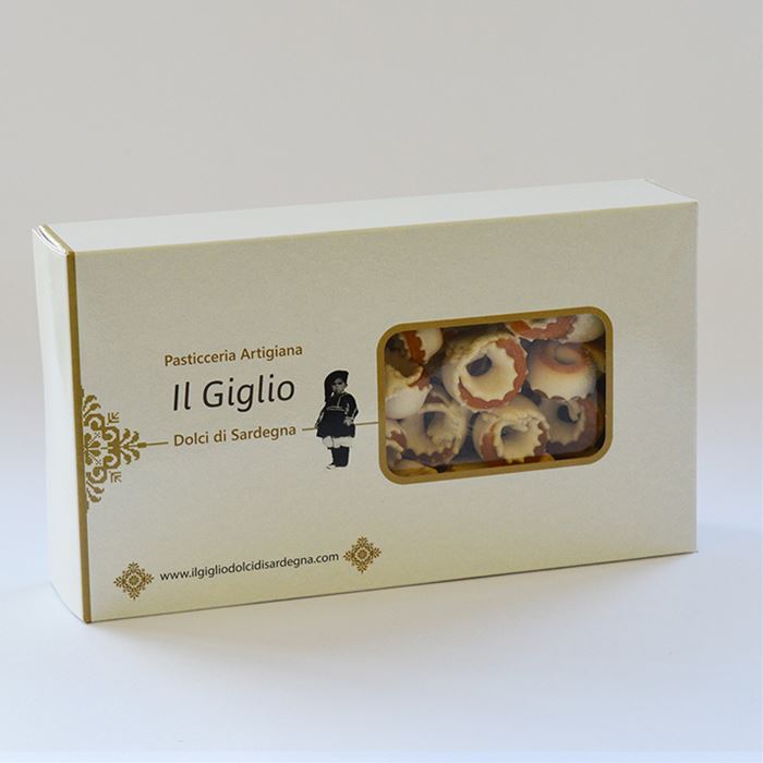 Biscotto ripieno di miele preparato interamente a mano. Realizzato con una sottile sfoglia di semola che si chiude ad anello su una densa crema di miele. Dolci sardi artigianali frutto della pazienza di mani esperte, che hanno affinato manualità e tecnica durante gli anni, e dell'unione di ingredienti di prima scelta che restituiscono, a chi assapora i nostri dolci, quei profumi e sapori ancestrali, di un sapere custodito dalla cultura gastronomica e dalle tradizioni locali.