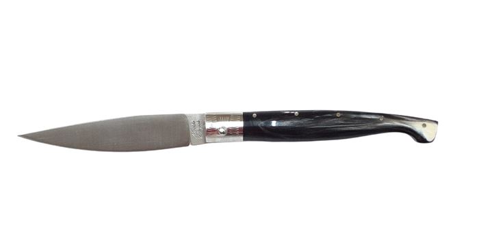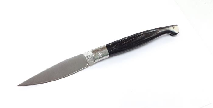 Manico con guancette in corno di bovino, collarino in acciaio 316, archetto e lama in acciaio 1.4116 ad uso alimentare