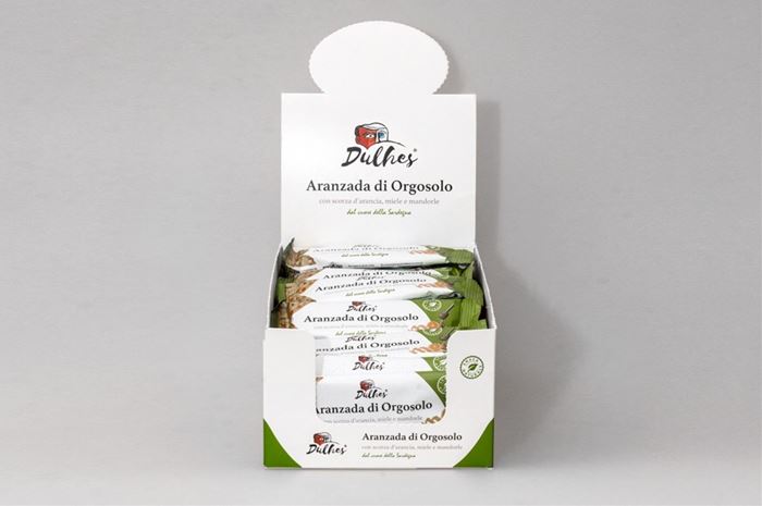 SINGOLA CONFEZIONE: Snack singolo da 25 g al gusto Aranzada con miele, mandorle e scorza d'arancia.