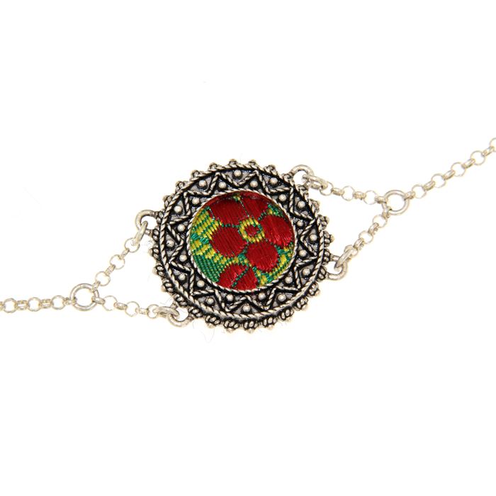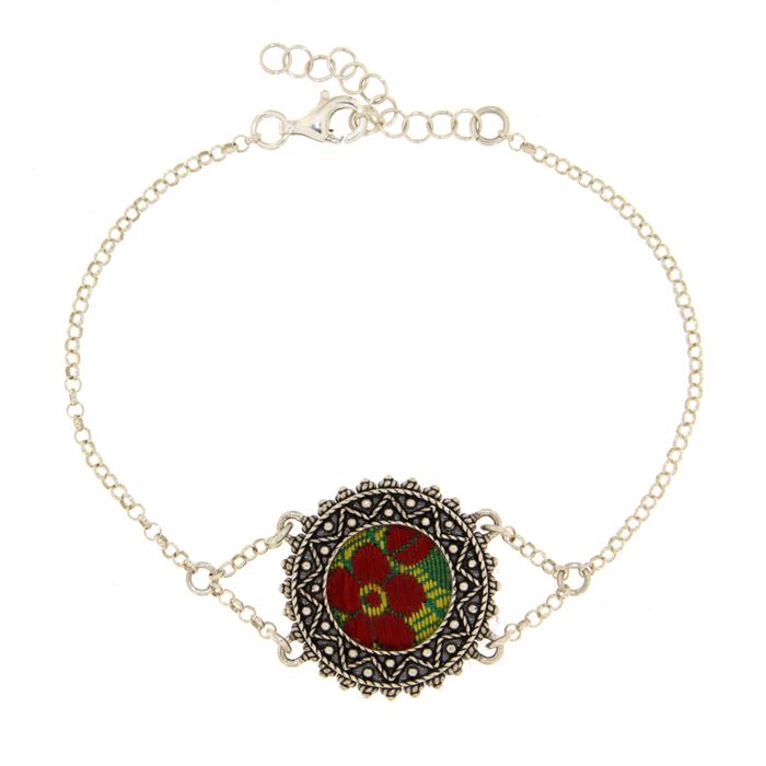 Consegna a € 9,99Bracciale in argento 925/1000 realizzato con catena rolò e un inserto di broccato a sfondo verde, inserito in una cornice decorata in filigrana. Il bracciale è realizzato in argento 925/1000 con la tecnica della filigrana sarda e della fusione a cera persa, rifinito e assemblato a mano.