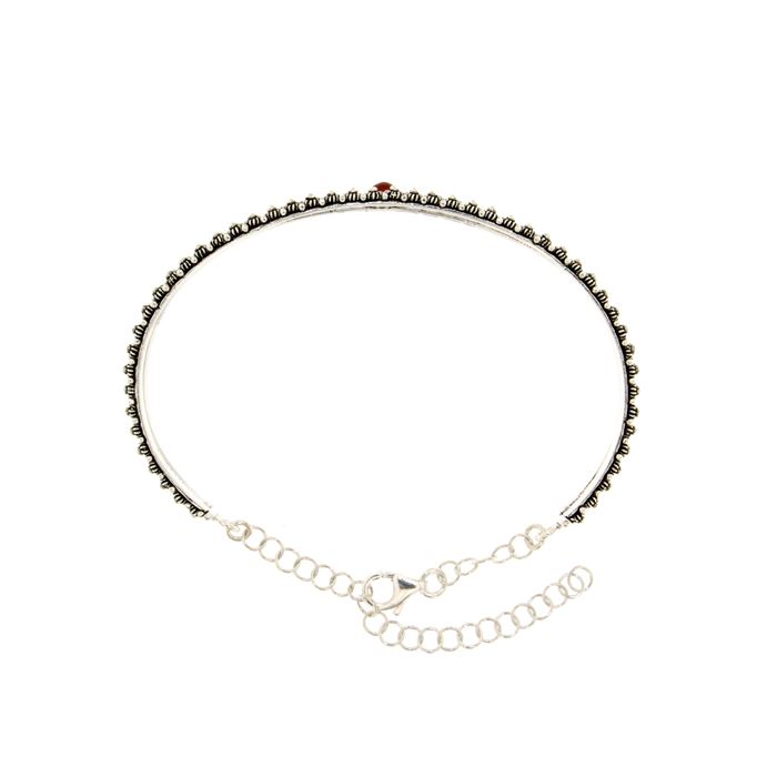 Consegna a € 9,99Bracciale rigido in argento 925/1000 decorato con due file di roselline in nido d'ape al cui interno è racchiuso il castone con un'agata corniola, il bracciale è chiuso da una catena con moschettone.