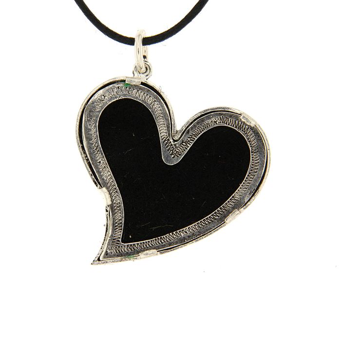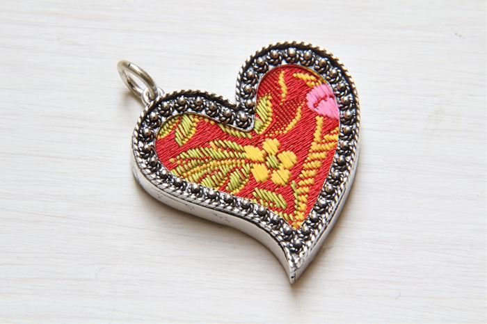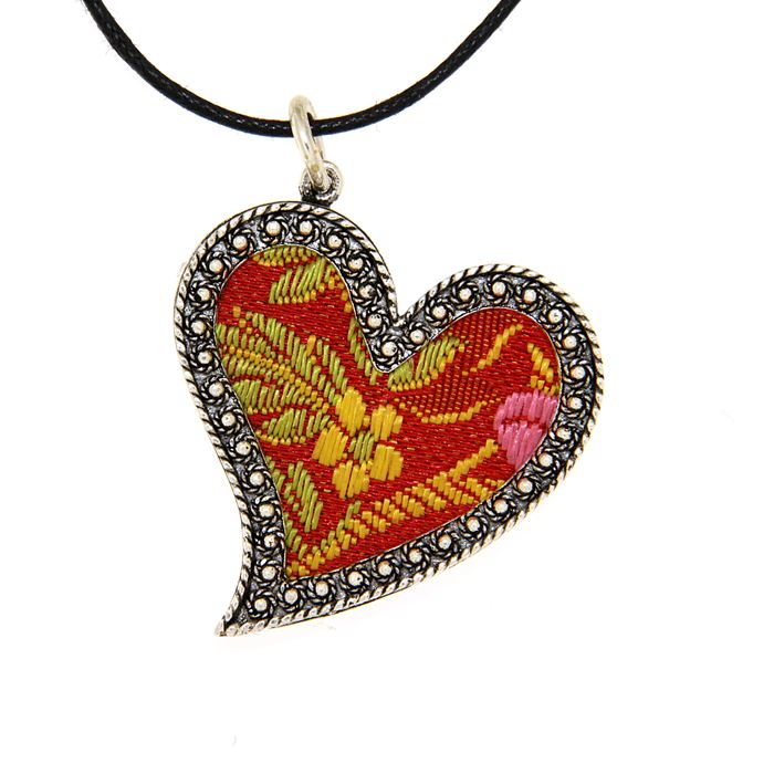 Consegna a € 9,99Ciondolo in argento 925/1000 formato da un cuore decorato in filigrana a nido d'ape al cui interno spicca l'inserto di broccato floreale a sfondo rosso, tessuto tipico degli abiti tradizionali sardi. Nel retro del ciondolo è presente una cornice decorativa. Il ciondolo è realizzato artigianalmente con le tecniche della filigrana sarda a nido d'ape, granulazione e fusione a cera persa, rifinito e assemblato a mano.