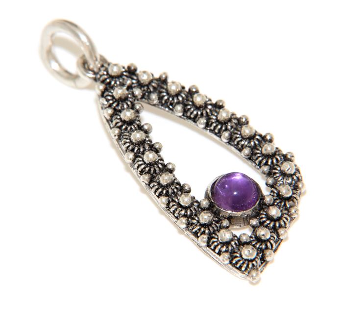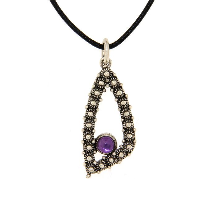 Consegna a € 9,99Ciondolo in argento 925/1000 con decorazione di roselline in filigrana sarda, le dolci forme del gioiello sostengono il castone con un'ametista taglio cabochon. Il ciondolo è realizzato artigianalmente con le tecniche della filigrana a nido d'ape e della fusione a cera persa, rifinito e assemblato a mano. Il cordoncino in cotone cerato nero, regolabile in lunghezza, è compreso nel prezzo.
