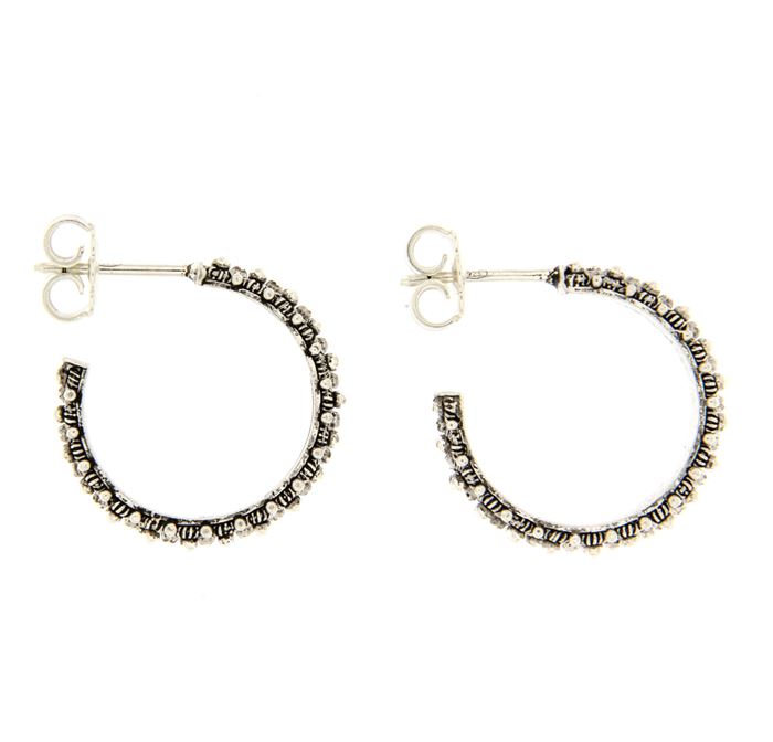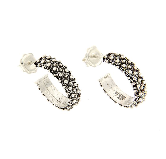 Consegna a € 9,99Orecchini a lobo in argento 925/1000 brunito a forma circolare con decorazione a nido d'ape a 2 fili. Gli orecchini sono realizzati artigianalmente con le tecniche della filigrana a nido d'ape e della fusione a cera persa, rifiniti e assemblati a mano.