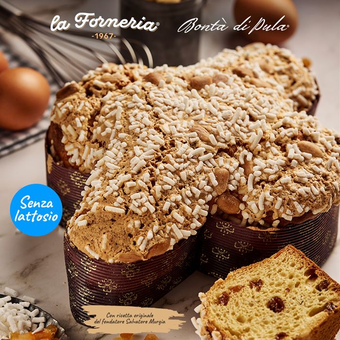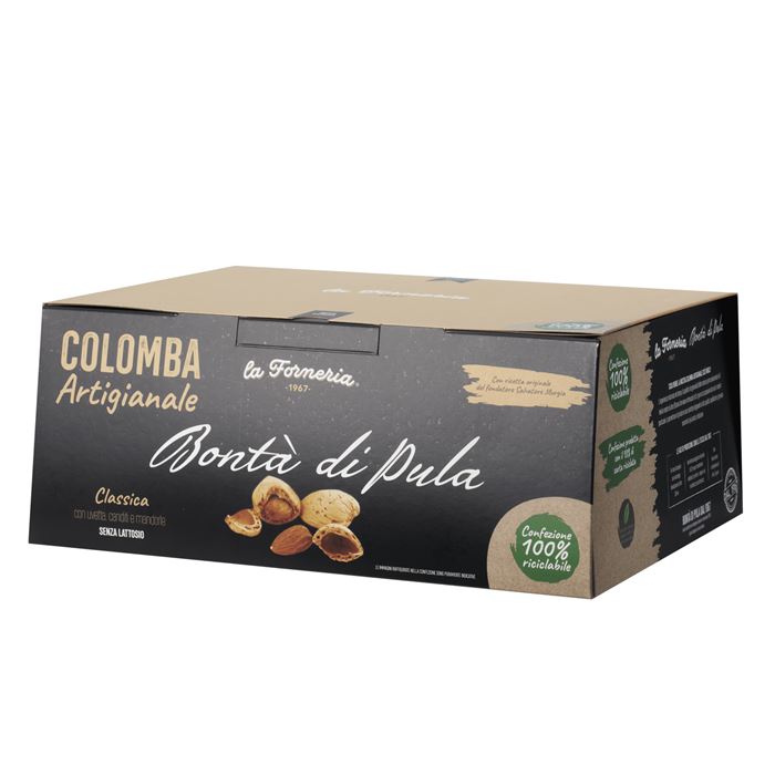 Colomba artigianale classica con uvetta e scorze di arancia candita, guarnita con glassa, zucchero in granella e mandorle pelate senza LATTOSIO.