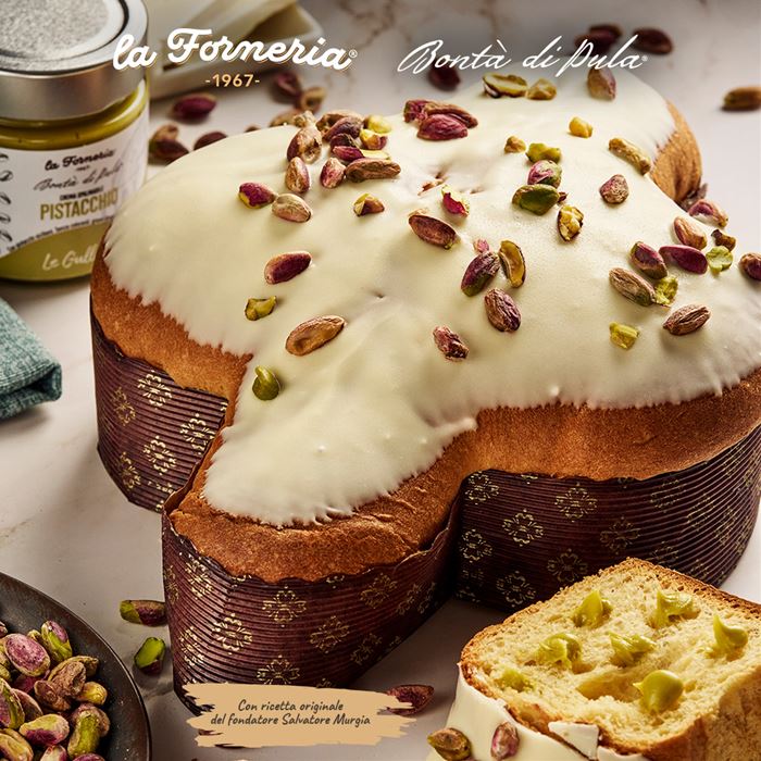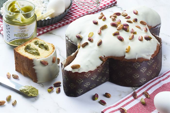 La nostra colomba di pasticceria si caratterizza per un impasto soffice, croccante copertura al cioccolato bianco, pistacchi interi tostati e con un vasetto di crema al pistacchio.