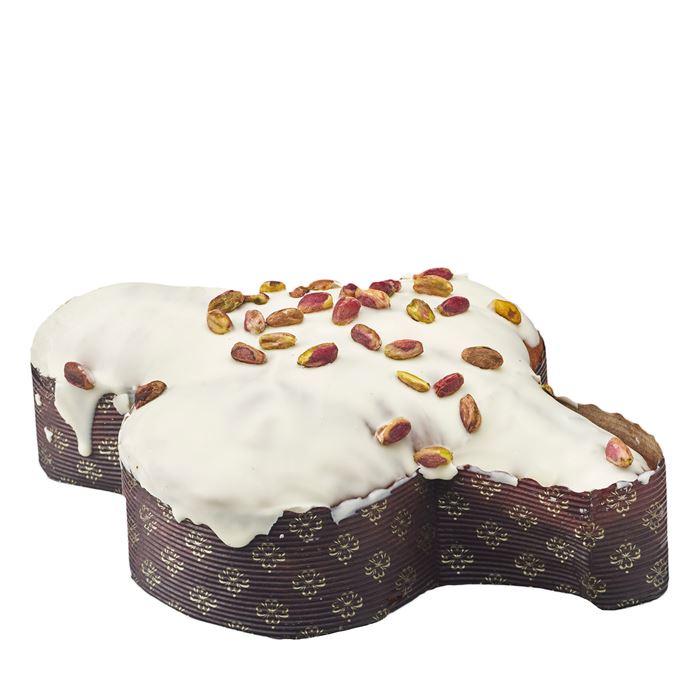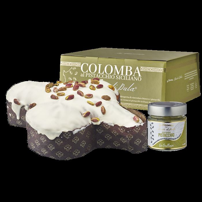 Colomba di pasticceria ricoperta di cioccolato bianco e pistacchi con vasetto da 200g di crema al pistacchio.