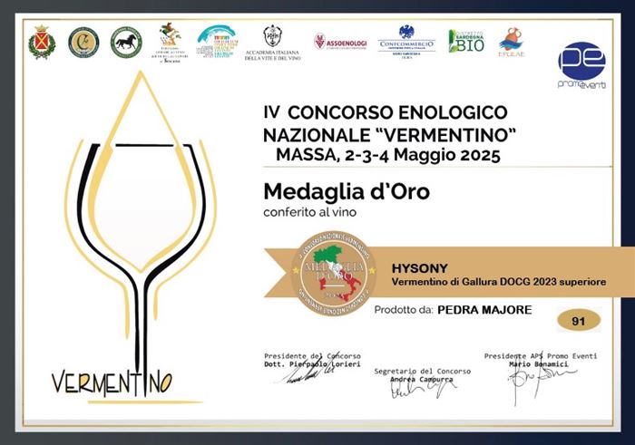 NOTE DELL'ENOLOGO: Hysony è prodotto da uve Vermentino D.o.c.g. di Gallura, maturate nell'alta collina della Gallura meridionale. Per produrre questo vino è stata fatta una attenta selezione delle uve del vigneto, controllando accuratamente tutte le caratteristiche degli acini, delle bucce e del succo, allo scopo di ottenere un vino strutturato pieno di corpo e fruttato.