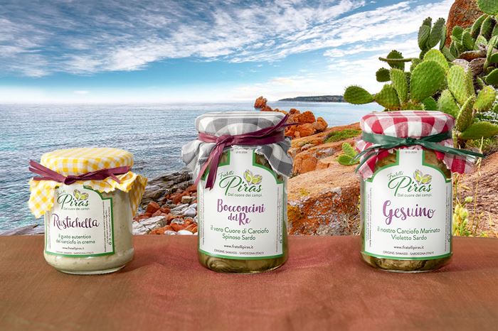 I F.lli Piras propongono in confezione regalo il tris di carciofini sott´olio, che contiene i carciofini marinati (carciofo spinoso e violetto sardi):