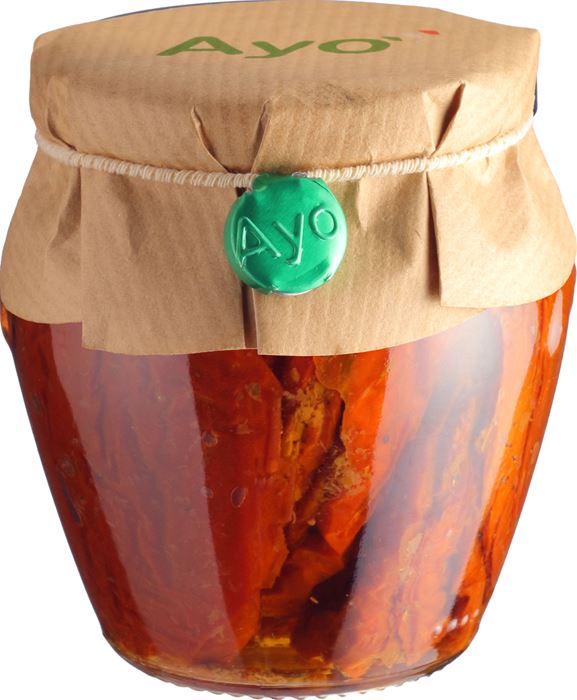 Lista degli ingredienti: Pomodori essiccati e ridratati 60%, Olio di semi di girasole, Olio extravergine di oliva, Farcitura 5% (Capperi, ACCIUGHE, Basilico, Origano, Pepe nero). Correttore di acidità: Acido lattico.