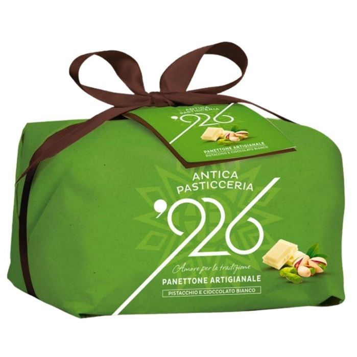 Panettone Artigianale con crema di pistacchio italiana ricoperto di cioccolato bianco, lavorato a mano con lievito madre utilizzando ingredienti di altissima qualità e una lievitazione naturale di 36 ore con conseguente riposo di 8 ore a temperatura controllata.